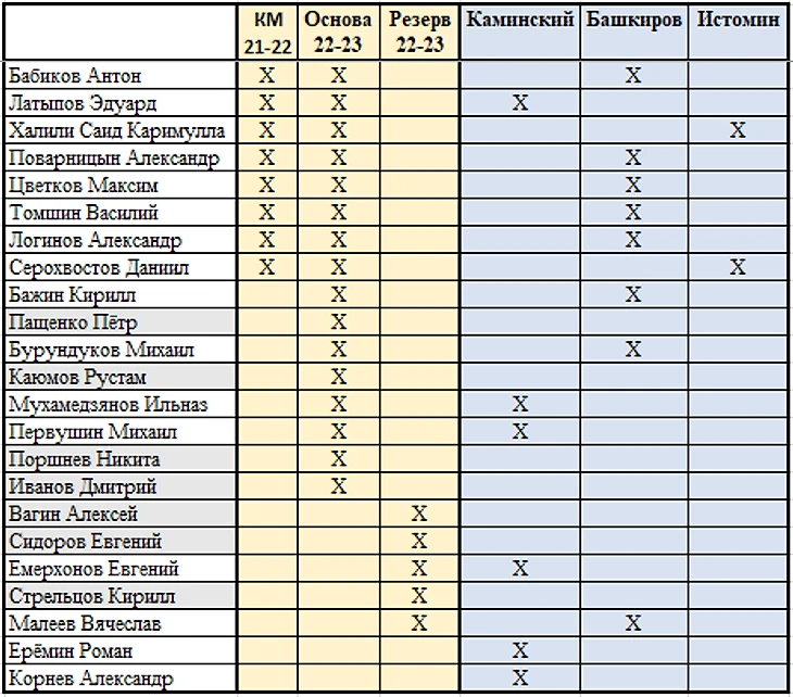 Из-за побега Халили и Серохвостова к Истомину в мужской табличке видим три колонки с тренерами. Я вот не понял смысла в этом побеге. Возможно, проявится по ходу сезона и по его итогам. Что ещё показалось любопытным: Ерёмин на сайте СБР не входит ни в какую сборную, но попал на ЦП к Каминскому. Корнев по возрасту ещё юниор, в составе юниорской команды, но тоже у Каминского. Считаю, что это хорошо. В предыдущем сезоне на этапах юниорского КМ показывал лучшие скорости в пелотоне.