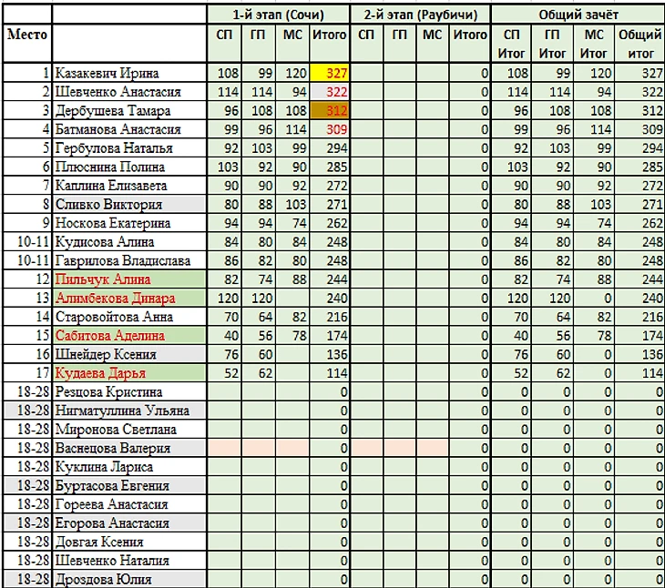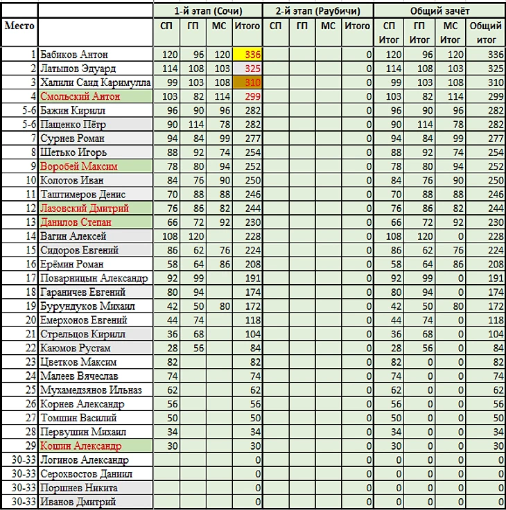 Что бросилось в глаза: из тех, кто в прошлом сезоне выступал на КМ (основа), в Сочи выступили всего двое - Казакевич и Шевченко. Упомяну тех из основы и резерва, кто пропустил первый этап.