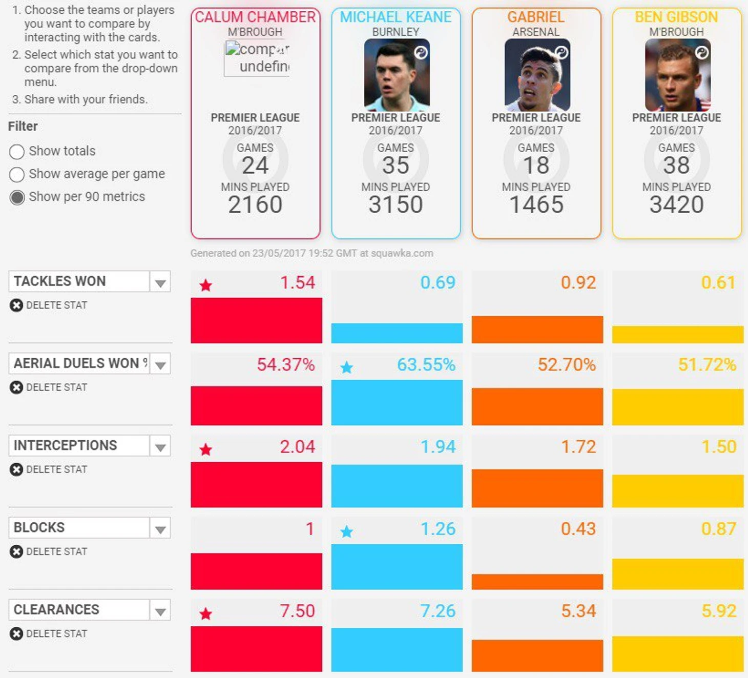 Что говорят цифры? Согласно порталу squawka, по таким статистическим показателям как: совершенные отборы, процент выигранных верховых единоборств, перехваты, блоки и выносы, Калум полностью превосходит одноклубника Бена Гибсона, который, тем не менее, заслужил вызов в сборную Англии. Защитник Бёрнли и недавний дебютант сборной Майкл Кин, которого пресса активно сватает в Манчестер Юнайтэд, лишь немного превосходит Чемберса по некоторым показателям. Канонир Габриэль Де Абреу Паулиста, который, как и Калум, способен сыграть и в центре и справа отстает от англичанина по всем статьям.