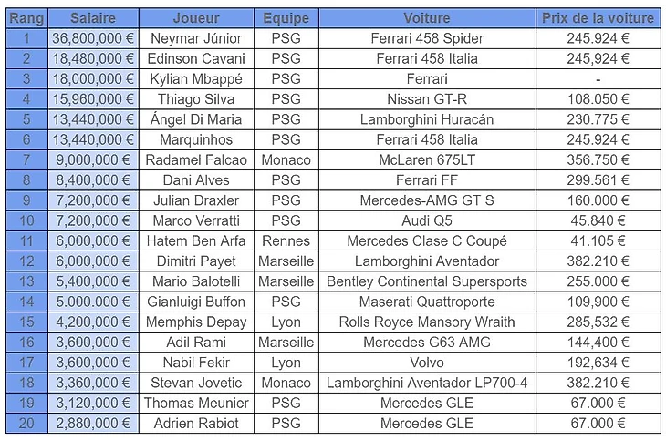 Вот удобная таблица. Игроки расставлены по размеру зарплаты, а не по цене их авто.