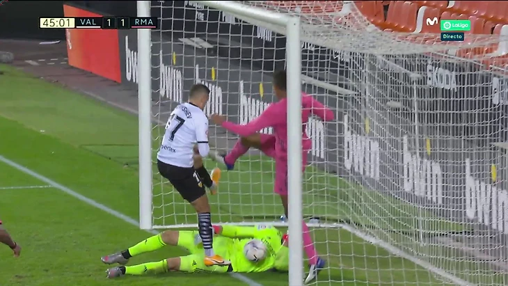 Решили, что надо перебивать: теперь Солер реализовал уверенно (хотя Куртуа угадал угол). Все ли по правилам? Абсолютно. Если игроки обеих команд в момент 11-метрового нарушают правила, удар надо повторить. В итоге комичные обстоятельства первой попытки целиком аннулировали, а «Валенсии» достался просто чистый гол с пенальти.