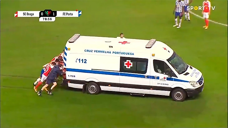 Теперь же история случилась в кубковой игре «Порту» и «Браги» – снова понадобилась экстренная медицинская помощь, а машина скорой застряла прямо на поле.