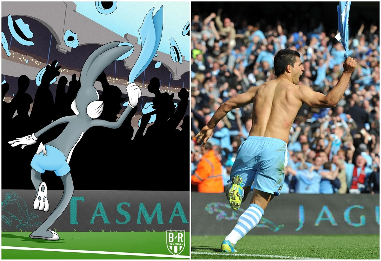 Еще один известный гол – Агуэро в ворота «КПР», принесший «Манчестер Сити» первое чемпионство, но в исполнении звезды баскетбола Багза Банни. Обратили внимание на пасхалку на рекламном щите?
