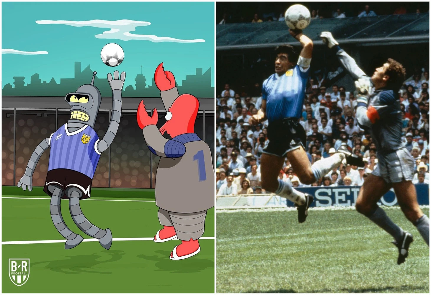 Если уж речь зашла про религию, то вот вам рука Бога от Диего Марадоны. В «Футураме» говорилось, что руки Бендера запрограммированы только сгибать вещи, но тут он ими еще и забивает.