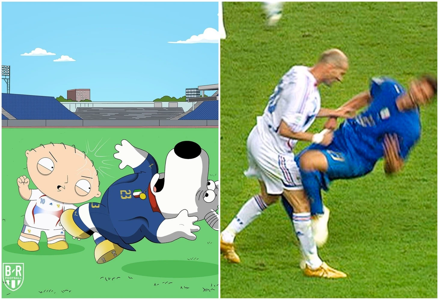 Матерацци попал сразу в два легендарных момента. Теперь его роль исполняет Брайан Гриффин, а за Зидана – Стьюи. При каких обстоятельствах произошел удар, надеемся, напоминать не надо.