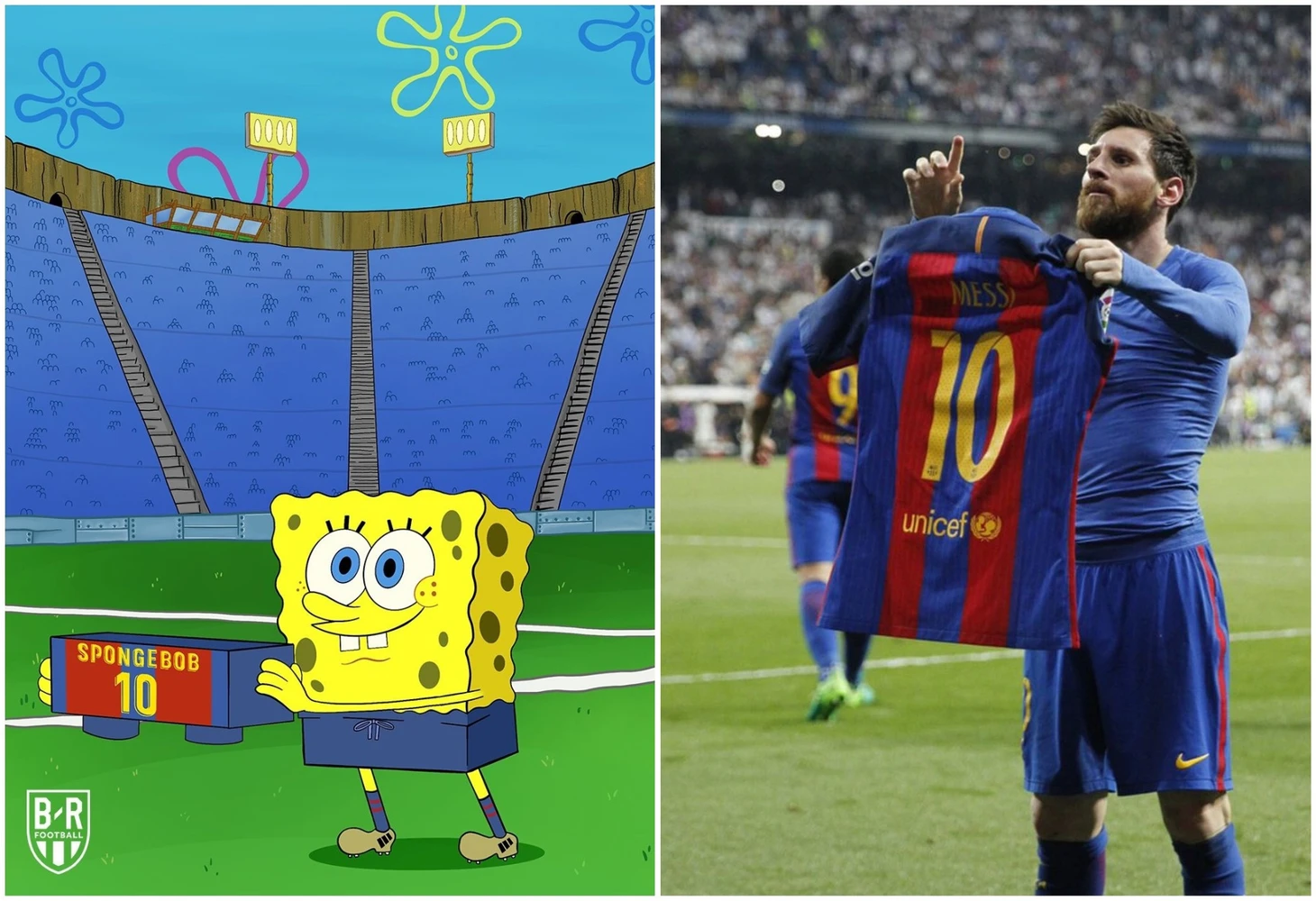 Помните, как Месси заставил замолчать «Сантьяго Бернабеу» в 2017 году? Забил победный гол на 92-й минуте и во время празднования показал трибунам свою футболку. Мультяшный вариант – Губка Боб показывает свои квадратные штаны.
