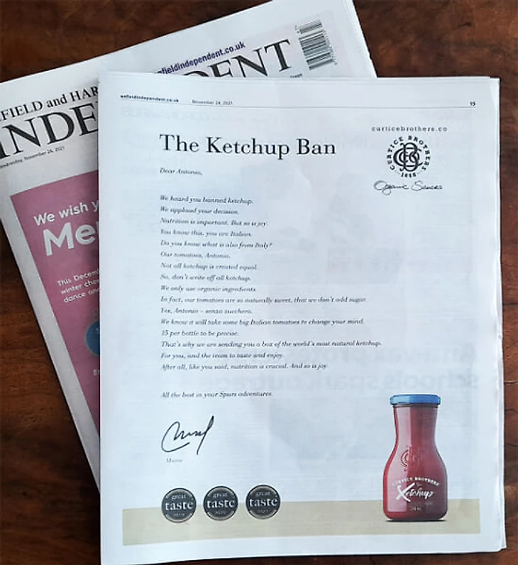 Но две недели спустя кетчуп все же появился на базе «Тоттенхэма». Постаралась австрийская компания по производству соусов Curtice Brothers, которая лучше всех сориентировалась в ситуативном маркетинге и отправила клубу коробку кетчупа. Тут же компания разместила рекламу в газете Enfield Independent, обратившись с открытым письмом к самому Конте.