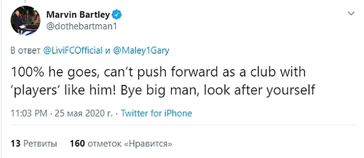 «100% он должен уйти, клуб не может продвинуться вперед с такими «игроками», как он! Пока, большой человек (рост Гари – 197 см), позаботься о себе», – написал полузащитник «Ливингстона» Марвин Бартли, в свое время поигравший за «Бернли» и «Борнмут».