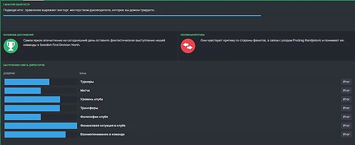 Новый руководитель клуба, сразу сказал что ждёт от нашего клуба минимум - место в верхней половине таблицы. При этом предлагался вариант, в котором мы получим большой трансферный бюджет и солидные деньги на зарплату, но от меня будут ждать выход в Премьер-Лигу. Я пока отказался, и поставил минимальные цели. Начало сезона через 2 месяца, и мы стартуем сразу с командой, которая вылетела из премьер-Лиги - GIF Sunsdsvall. Сезон будет определяющим как для меня, с т.з. моих компетенций в клубе, так и для всех остальных с т.з. моего желания остаться, ведь через 10 месяцев у меня заканчивается контракт, и если руководство не даст мне возможности развивать клуб дальше, я скорее всего покину его.