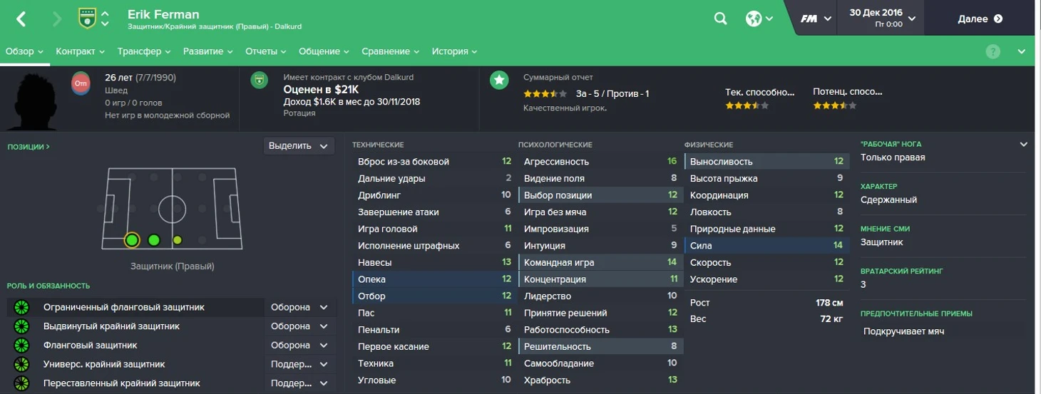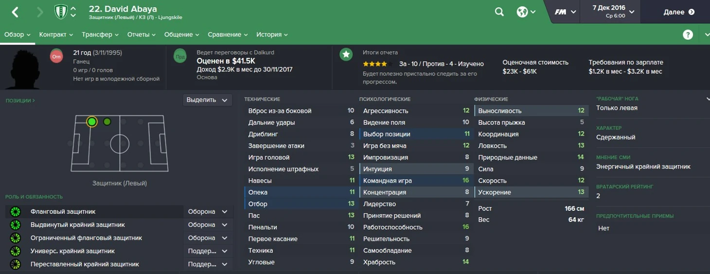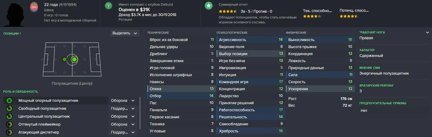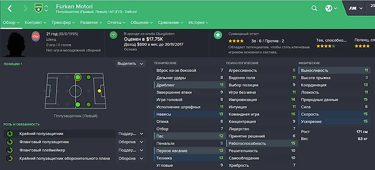 На его места я могу купить суперзвезду по меркам нашего клуба из Эльфсборга. Но, это бы стоило 200к$, пускай и в рассрочку и огромный личный контракт. Долго думая, я решил не тратить финансы сразу все, т.к. ещё предстоит укрепить пару позиций. "Мотор". конечно проигрывает по скиллам, но он быстрый, техничный и вполне способен усилить нашу атаку уже сейчас. Имеет опыт игры в Премьер-Лиге, техничный, с пасом, навесом и хорошей скоростью. Обожает бить на точность, смещаться с флангов в центр. нужно будем подумать как его выкупить после аренды.