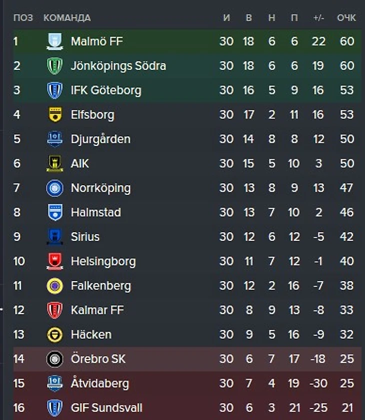 В премьер-лиге чуда не состоялось, Мальме стал чемпионом в последнем туре, из-за осечки главного конкурента, который очень долго лидировал в чемпионате, клуба - Йёнчёпингс Сёдра ИФ. По разнице мячей Мальме стал чемпионом, и это очень хорошо - с их составом есть хоть какие-то шансы в Лиге Чемпионов и соотв. продвижение Швеции в таблице коэффициентов. Напомню, что они прошли 3 квалификационных раунда в этом розыгрыше, и солидно пополнили копилку Швеции, в отличии от всех остальных клубов которых вылетели в Лиге Европы.