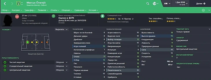 Выбирал между ним и ещё одним товарищем который всю карьеру играл в соседнем дивизионе. Оверсьо без особых провалов, хорош в игре головой, отличные физ.данные да и опыт у него хороший. Начинал в Премьер-лиге в Эльфсборге, потом 6 сезонов играл в дивизионе в который мы вышли. Планирую его задействовать в основе. судя по отчётам скаутов идеально подходит под нашу тактику, и на данный момент является сильнейшим ЦЗ в команде.