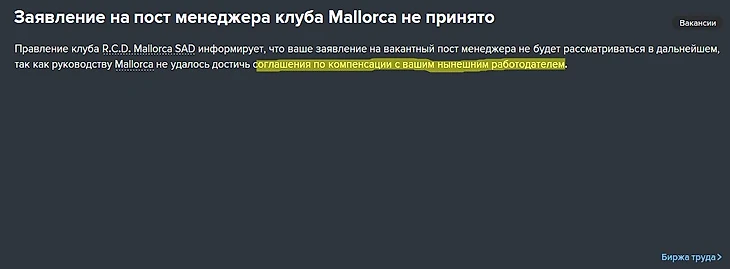 Я немного поддался эмоциям, и начал смотреть в сторону других клубов, несмотря на ещё один год по контракту в клубе. И тут совершенно неожиданно, я увидел что Мальорка - клуб, который когда-то тренировал Валерий Карпин сейчас без тренера. Я бегло изучил условия клуба, и несмотря на 21 место в Сегунде я всё равно решил подать свою заявку, и через пару дней пришёл вот такой ответ: