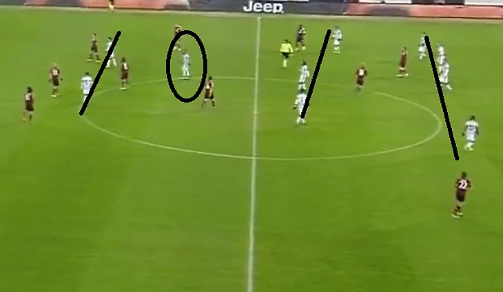 Если мы сосредоточимся на их 4-3-1-2, на основе "ромба", Андреа Пирло был плеймейкером, который играл глубоко для плеймейкера, Клаудио Маркизио занимался отборами и перехватами, Погба и Артуро Видаль играли под нападающим (в частности, Карлоса Тевеса).
