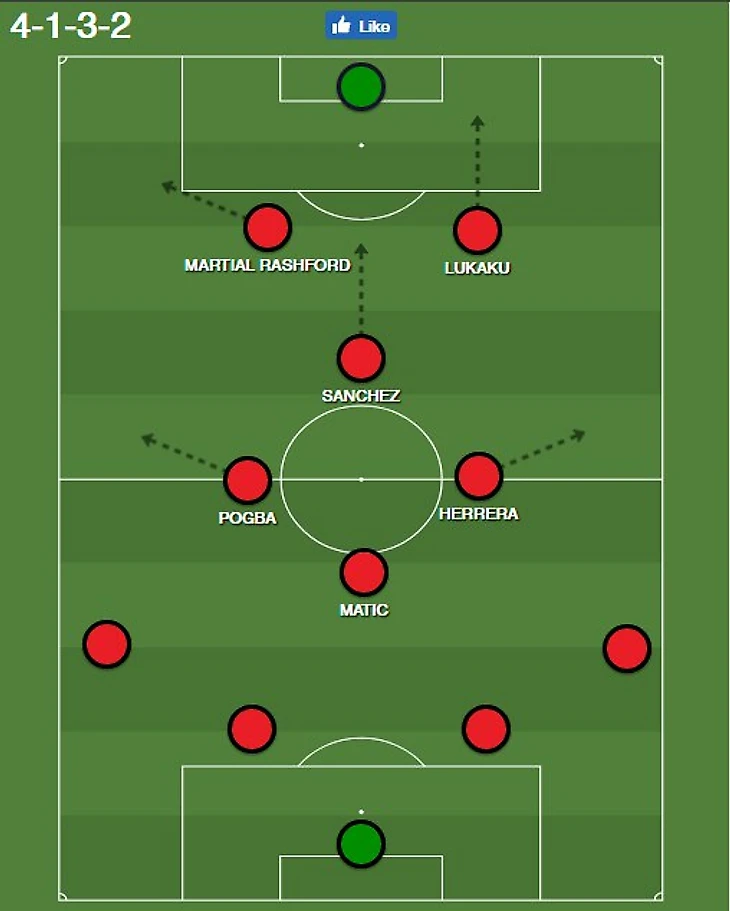Португалец может попробовать данную тактику на Олд Траффорд, вопрос в том, даст ли она результат и получится ли. Погба, естественно будет играть на левом фланге с Неманьей Матичем в опорной и Андер Эррера рядом с ним, но правее. Алексис Санчес, питбуль клуба который станет создавать моменты для партнеров, Лукаку - как силовой нападающий, в случае, когда нужно продавить и Марсиаль, Маркус для скоростных атак.