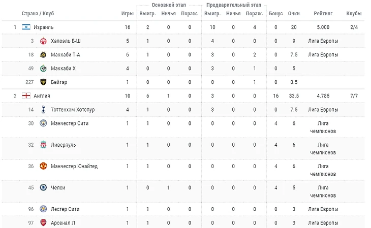 А есть ли шансы у Израиля остаться на первом месте после второго тура? Практически никаких. Даже в случае двойной победы в гостях (ХБШ у Ниццы и МТА у Сивасспора) Англия, Италия и Испания вполне могут обойти Израиль. Для этого клубам АПЛ надо набрать всего 9 очков из 14 (победа - 2, ничья - 1), итальянской Серии А - уже 11 и Ла Лиги - аж 13. Италия с Испанией (Ювентус с Барсой и Сосьедад с Наполи) вынуждены будут поделить очки между собой в этом туре, а где-нибудь и остальные их представители еще пару очков потеряют. С Англией все гораздо хуже, семь игр, а надеяться просто не на кого. Ну, если только Краснодар разберется с Челси, Лейпциг сумеет что-то сделать с МЮ... Шансы остаться на первом месте у нас призрачные. Еще и свои игры надо брать.
