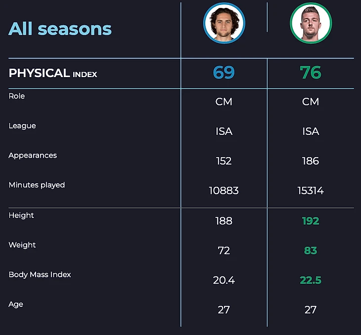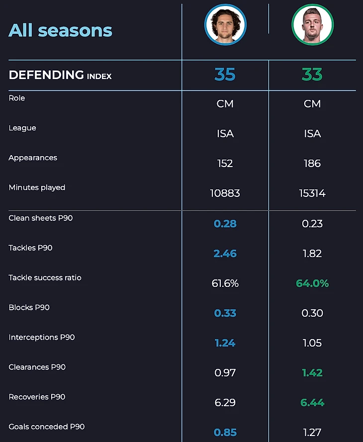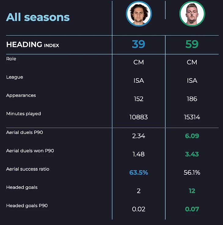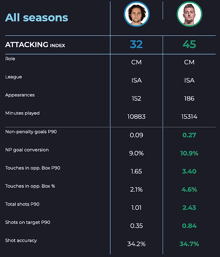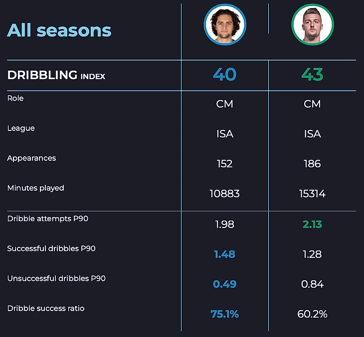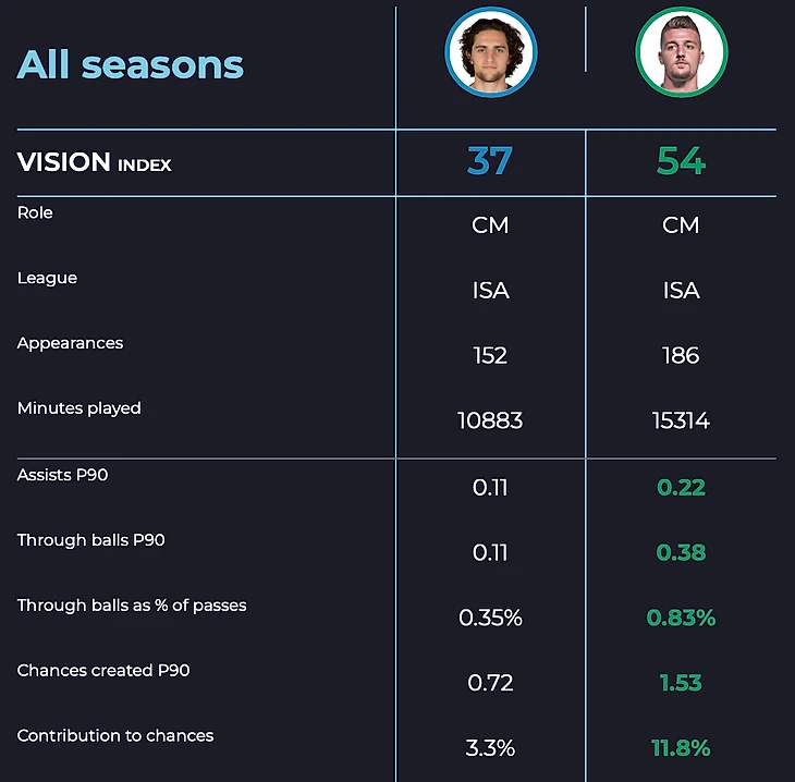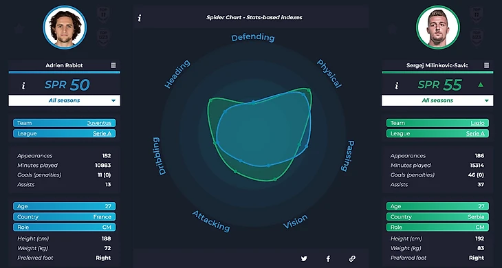 Итого, подводя черту, выделим главное: играя то на левом фланге, то под атакой, то в центре поля, Рабьо сильно зависел от партнеров и долго думал перед каждый действием. После индивидуальной работы с нынешним тренерским штабом и переходом в опорную зону на несколько месяцев Рабьо начал заметно расти в игровом плане и сейчас даже близко не похож на того футболиста, что перешел в Ювентус в 2019 году. Чтобы не быть голословным, перейдем на язык цифр. В качестве точки опоры и образца для сравнения возьмем в пару к французу Сергея Милинковича-Савича - главную звезду центра поля в Серии А и давний объект желания Ювентуса.