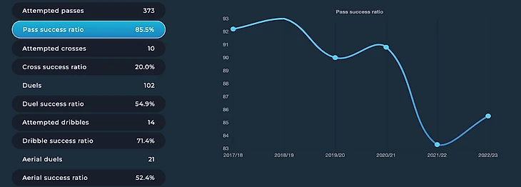 Прямо сейчас Рабьо - системообразующий футболист Ювентуса. Он участвует во всех атаках, в организации прессинга, почти все передачи идут через него так или иначе, он подсказывает партнерам, действует смелее, точнее, опаснее. За сыгранные 11 игр на его счету уже 3 гола и 2 голевые передачи. Показатели реализации - самые высокие в карьере, но при этом просели точность передач, процент успешного дриблинга и выигранных дуэлей один в один. Рабьо становится по функционалу все больше приближен к Милинковичу-Савичу, следовательно динамика всех ключевых показателей наблюдается та же ввиду роста объемов работы, повышения риска и более частым перемещении вперед.