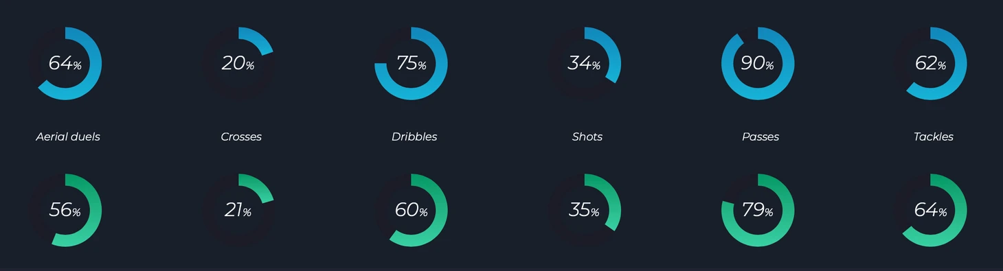 Начнем с общего сравнения по главным семи игровым показателям в среднем расчете на 90 минут, которые обновляются после каждой игры в ту или иную сторону, это оборонительный показатель, физический, культура паса, видение поля, атакующий показатель, техническое оснащение (дриблинг), и игра на втором этаже.