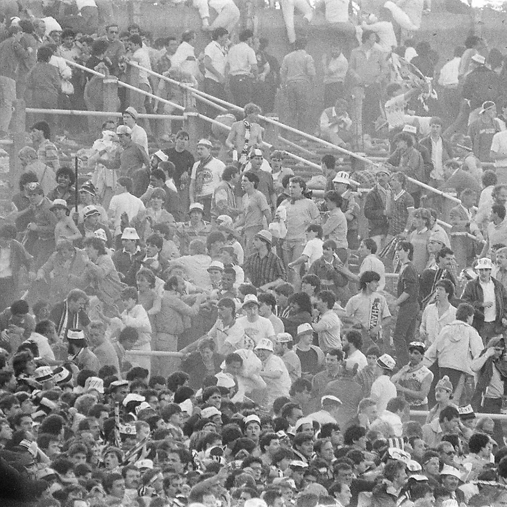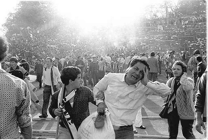 Пораженный масштабами кровавой драки, отряд бельгийских полицейских, всего из двадцати человек, которому было поручено покончить с насилием, допустил серьезную ошибку в оценке происходящего. Силы наведения порядка, считая, что они имеют дело с недисциплинированными болельщиками, стремящимися завладеть футбольным полем, поспешили блокировать все входы и выходы, вместо того чтобы открыть их как можно шире и не препятствовать эвакуации болельщиков с трибун. И вот толпа болельщиков оказывается зажатой между небольшой бетонной стеной и решеткой, которые отделяют трибуну от поля. Первые ряды падают, и их затаптывают напирающие сверху. Вдруг все приходит в движение. Стена разваливается под давлением этого гигантского людского слепого тарана. В тот же момент ломаются решетки и начинают разрывать тела прижатых к ним людей. Трагедия достигает апогея, но никому на стадионе не приходит в голову, что эта стычка между болельщиками на самом деле уже превратилась в кровавую, не поддающуюся контролю бойню. Полицейские направлены для регулирования прохода болельщиков на стадион. Ловушка захлопывается! Обезумевшие люди, стремясь вырваться из района драки, топчут упавших, тела которых нагромождаются друг на друга. Их десятки. У некоторых оторваны руки или ноги. Остальные толпой нахлынули на решетки, которые несут смерть. В этом скопище людей, охваченных ужасом и безумием, каждый ведет борьбу за выживание, рассыпая удары кулаками и ногами, чтобы выбраться из этого бушующего на трибуне вулкана. За несколько секунд тридцать восемь человек лишились жизни. Футбольный праздник превратился в ужасную бойню. Здесь свирепствует пьяный террор, терpop слепой, неорганизованный, который уничтожает все на своем пути."
