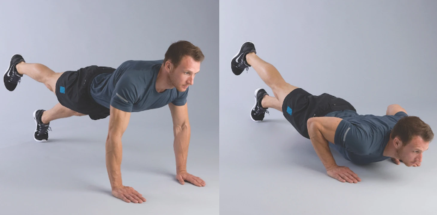 Примите упор лежа. Оторвите одну стопу от пола. Сделайте отжимание. Поменяйте ноги и отожмитесь еще раз. Это два повторения.
