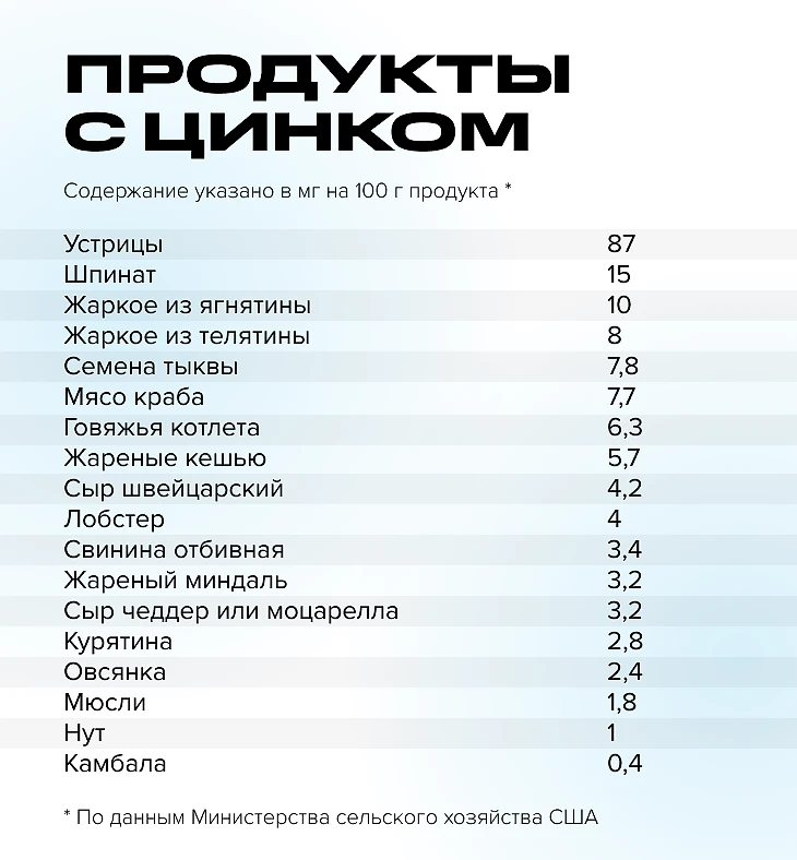 Цинк важен для иммунной и репродуктивной систем. Вот норма потребления в день и подсказка, в каких продуктах искать