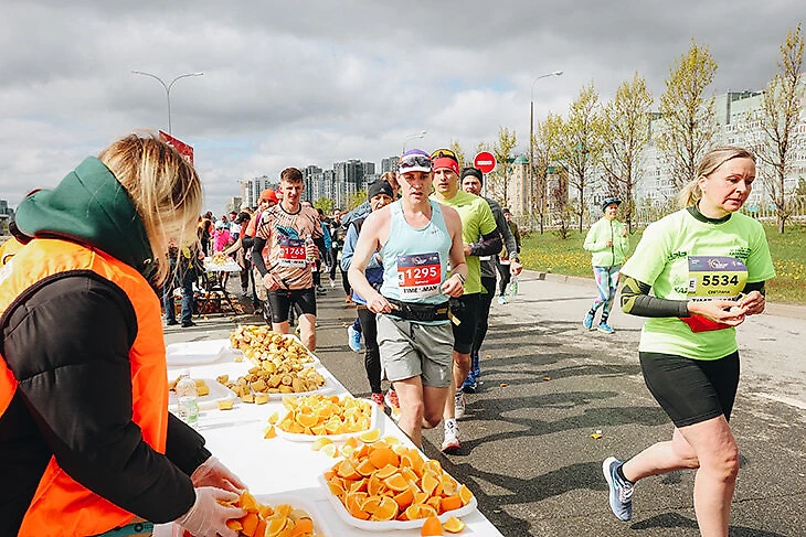 Уложиться в финишное время поможет команда пейсмейкеров – опытные спортсмены, которые будут бежать дистанцию с заданным темпом. Их можно узнать по ярким футболкам и флагам с обозначением темпа и финишного времени.