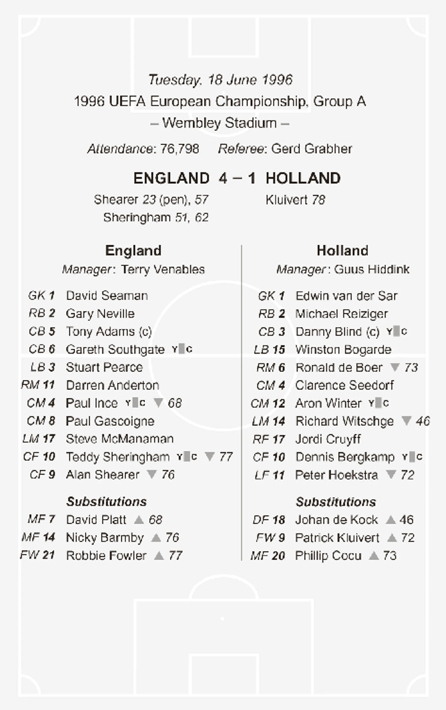 В матче со сборной Шотландии, который непосредственно предшествовал победе над голландцами, сборная Англии выиграла, сыграв в три центральных защитника. Тот же состав играл при гибкой схеме с четверкой защитников против Голландии. «В преддверии турнира мы провели товарищеские матчи и работали над различными способами игры и системами, — рассказал мне Невилл о подготовке к Евро-96. — Мы работали над системой сборной Голландии четыре или пять игр, прежде чем сыграли против них».