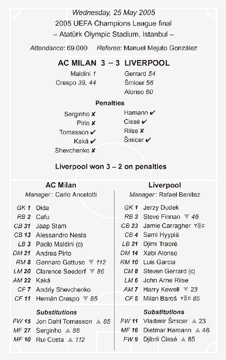 В трех предыдущих победах «Милана» в Еврокубках, в 2003, 1994 и 1990 годах, они носили свой полностью белый второй комплект и начинали слева, атакуя на правую сторону с точки зрения скамейки запасных. Мальдини выиграл жеребьевку с Джеррардом и поменялся сторонами поля, чтобы повторить этот образчик, что необычно в финале кубка. Может быть, он помнил те победы. Может быть, он думал наперед. Пенальти были назначены у трибуны стадиона, где находились болельщики «Милана».