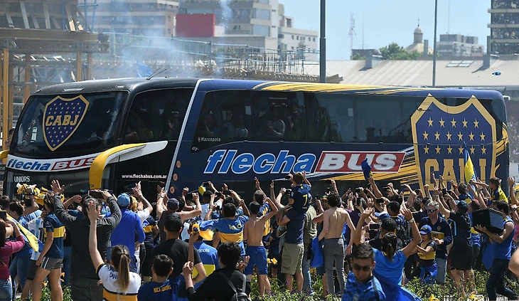 Когда командный автобус «Боки» проехал по главной avenida, люди начали бросать предметы, в том числе литровые бутылки из-под пива. Несколько стеклянных бутылок попали в автобус, разбив стекла. По-видимому, в то же время, когда это происходило, полиция стреляла в толпу слезоточивым газом. Но из-за разбитых окон бо́льшая часть слезоточивого газа попала в автобус. Капитан «Боки» Пабло Перес, среди прочих, жаловался на то, что ему в глаз попало разбитое стекло, а у других глаза пострадали от слезоточивого газа. По мере того, как просачивались новости, на стадионе и вокруг него царил хаос, поначалу неизбежно было много дезинформации, но результат был бы тот же: игру пришлось отложить.