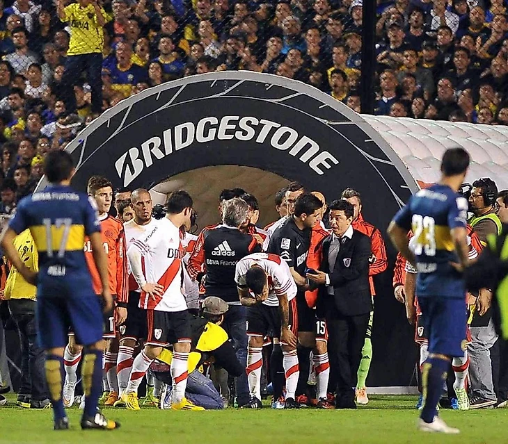 Это superclásico стало одним из таких примеров. В Южной Америке стадионы, как правило, имеют отдельные туннели для каждой команды, зачастую идущие из-под земли. Для защиты игроков развернуты надувные туннели. Одним из преимуществ является то, что болельщики не могут видеть их приближение, хотя зачастую телекамеры, направленные в туннель, или движение людей на выходе из туннеля это выдают. Когда игроки «Ривер Плейт» поднимались по лестнице из раздевалки через надувной туннель, болельщик «Боки Хуниорс», прижавшись к ограждению, отделявшему La Doce от поля, сумел просунуть руки, прорезать дыру в пластике и распылить перцовый баллончик на игроков соперника, когда те возвращались на поле к началу второго тайма.