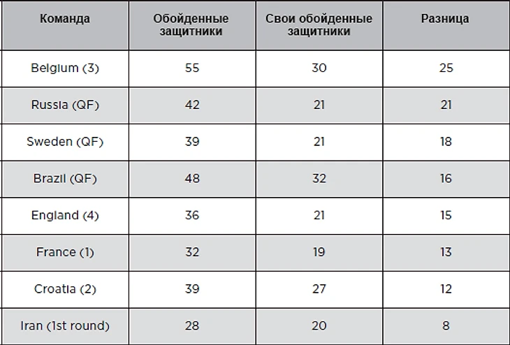 На Евро во Франции (2016) 34 из 51 игры выиграли команды, которые обошли больше игроков, чем их соперники. Только три потерпели поражения. Связь между победой и Packing была намного сильнее, чем между победой и статистикой точности передач или владения мячом. В России два года спустя та же динамика была заметна и на групповом этапе. По общему признанию, три игры на команду — это небольшой размер выборки, но семь из восьми команд с наибольшим количеством обойденных защитников вышли в плей-офф. Только сборной Ирана несколько не повезло, что она выбыла на ранней стадии.