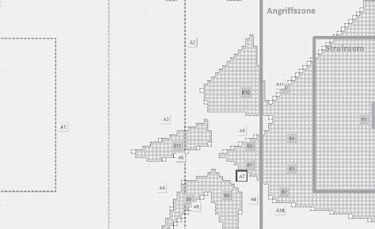 Бременцы атакуют слева направо, «Кельн» контролирует серое пространство. На данный момент «Вердер» уже контролирует 31,5% своей зоны атаки и 1,6% штрафной «Кельна», крошечного квадрата на левой стороне атаки.