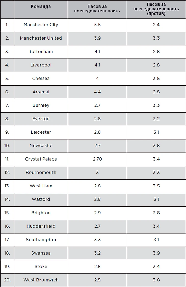 Однако количество времени, затрачиваемого на владение мячом, сильно различается. В сезоне 2017/18 в Премьер-лиге команды в среднем совершали от 5,5 («Манчестер Сити») до 2,5 («Сток Сити», «Вест Бромвич Альбион») передач за последовательность. Существует явная разница между командами, желающими и способными контролировать мяч в течение более длительных периодов, и теми, кто настроен быстрее идти вперед, совершая меньше передач. Существует соответствующее значение для последовательностей без владения мячом, определяющее количество передач соперников, но разрыв между командами там не так заметен. Атакующий «Ман Сити» Гвардиолы позволял соперникам передавать мяч в среднем лишь 2,4 передачи за последовательность, в то время как «Суонси» был самой пассивной командой, отдавая сопернику 3,9 передачи за последовательность (см. таблицу ниже).