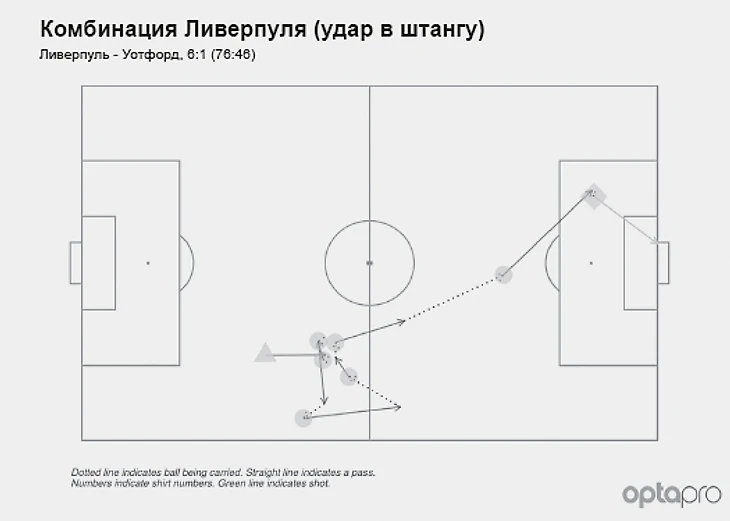 Современная технология трекинга позволяет измерять темп последовательностей. Этот пример из матча «Ливерпуль» - «Уотфорд» (2016/17) показывает, как это делается. Команда Юргена Клоппа выиграла мяч благодаря удару головой Жоэля Матипа, который здесь представлен треугольником. Последующее движение мяча следует прямым линиям (для передач) и пунктирным линиям (для игроков, продвигающих мяч вперед). За 14,5 секунды между ударом головой Матипа и ударом в створ ворот мяч прошел 126,44 метра, что составило чистое расстояние 55,96 метра. Деление пространства, пройденного вверх по полю, на промежуток времени последовательности дает значение, которое OptaPro называет «Прямой скоростью». Для этой атаки она составляла 3,85 метра в секунду.