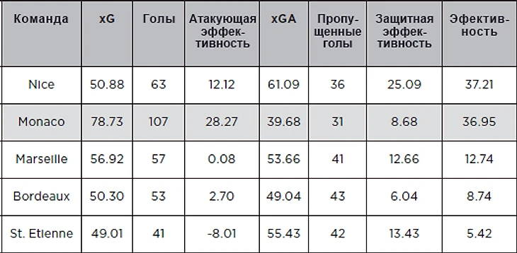 Все это довольно впечатляюще по отношению к ресурсам этих клубов. Но лежащие в основе статистические данные для его команд одновременно сенсационны и сбивают с толку. В «Менхенгладбахе» и «Ницце» команда Фавра значительно превзошла ожидаемые показатели как по забитым голам (xG), так и по пропущенным (xGA). Вот как в этих условиях сложился сезон Лиги 1 2016/17.