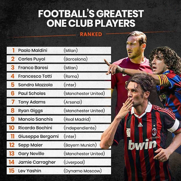 Паоло Мальдини («Милан») — в его карьере была только одна команда: 25 лет в клубе, плюс 7 лет академии, 26 трофеев из которых 5 Кубков чемпионов и 7 побед в Серии А;