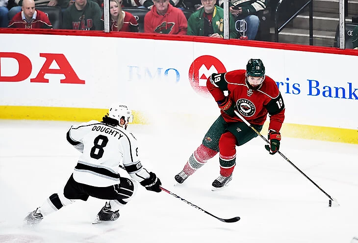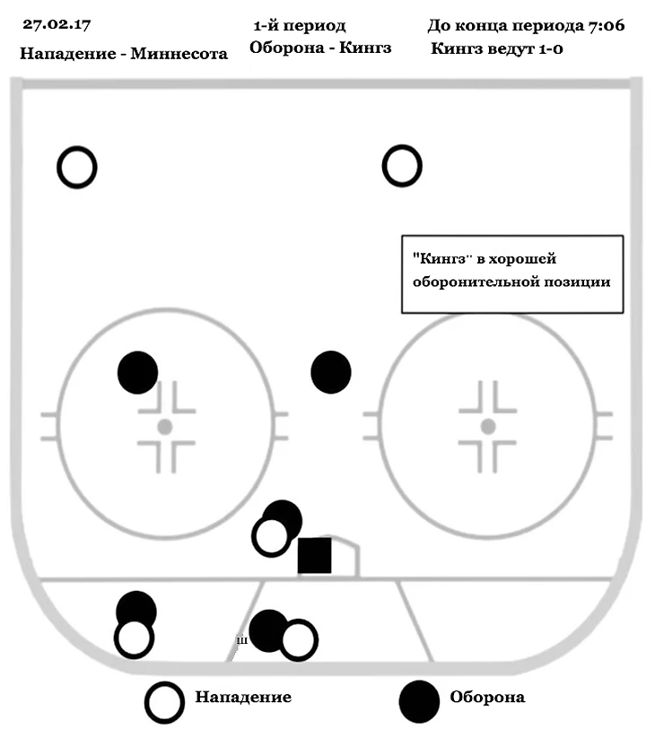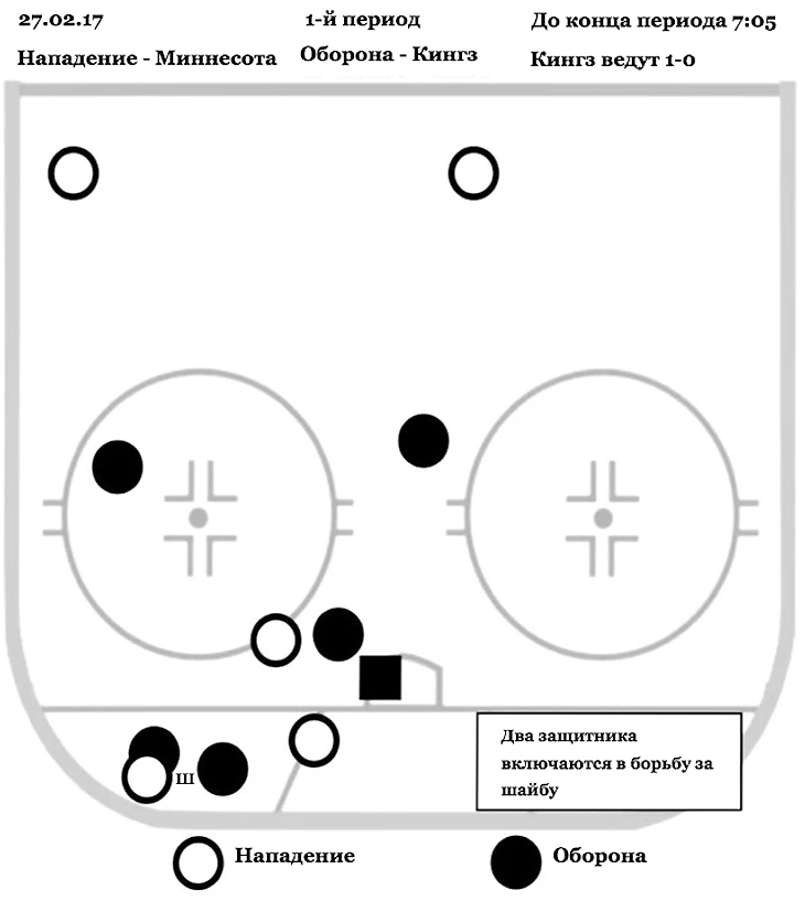 «Лос-Анджелес» ведет у «Миннесоты» 1:0 примерно за 7 минут до конца первого периода. После того, как игроки «Уайлд» выиграли вбрасывание в зоне атаки и нанесли бросок мимо ворот, у борта завязывается борьба за шайбу. Все начинается с единоборства за воротами (см. картинку ниже).