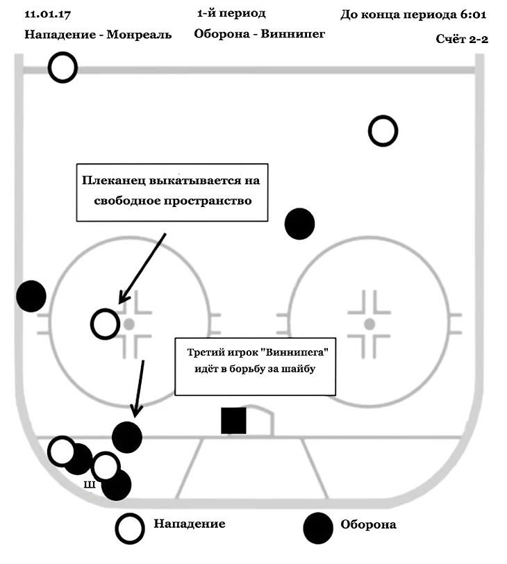 Затем в борьбу вступает третий игрок «Виннипега». Это далеко не редкость в НХЛ, но это стоит рассмотреть внимательнее. Третий игрок «Джетс» приехал из зоны опасности, оставив огромный игровой простор нападающему «Монреаля» Томашу Плеканецу.