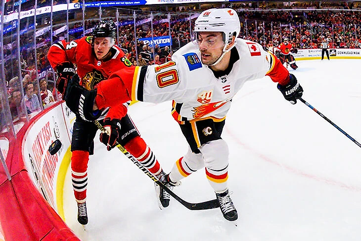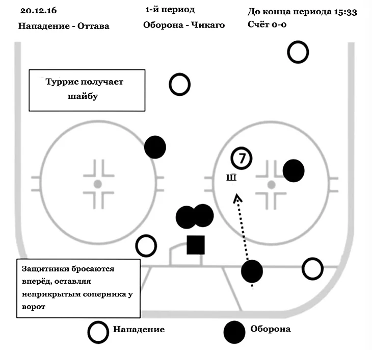 После броска мимо ворот шайбу отбросили к борту, где вступили в борьбу за нее игрок «Оттавы» и игрок «Чикаго». На нижеприведенной картинке мы видим, что два игрока «Чикаго» остались у своих ворот. Впрочем, наверное, одному из защитников следовало бы быстрее переключиться на Кайла Терриса (#7) – неприкрытого и в очень опасной позиции.
