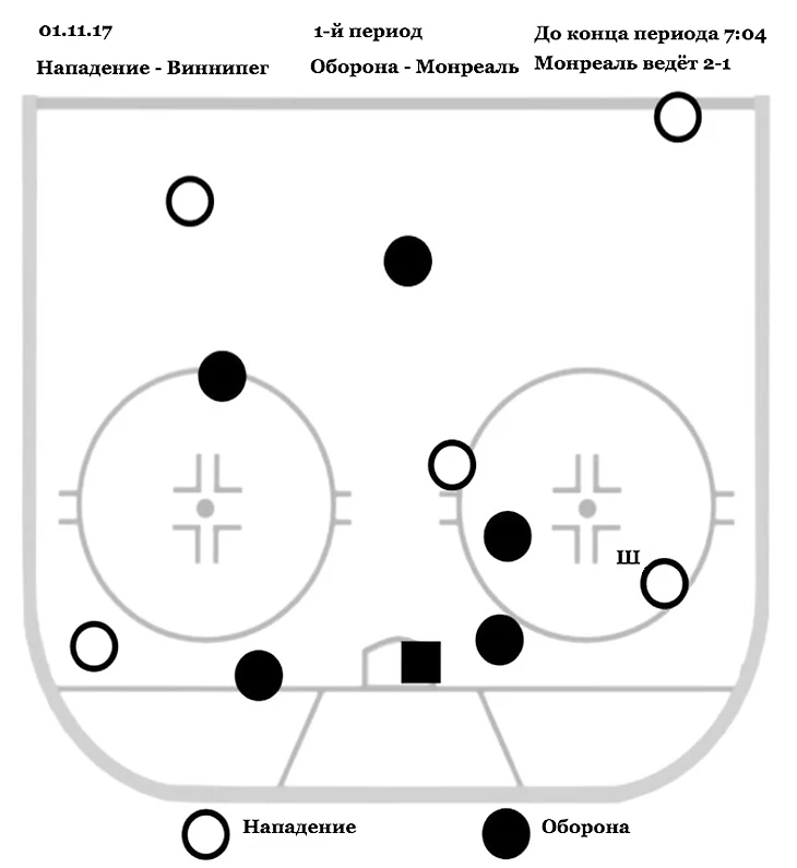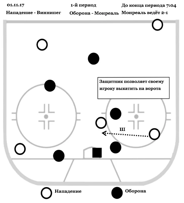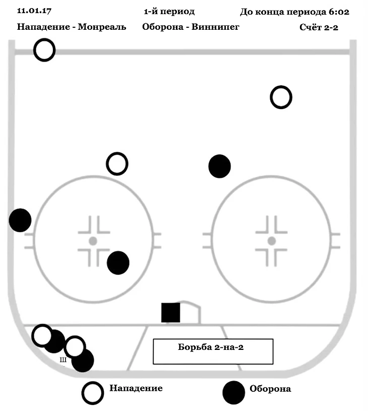 После вышеприведенного примера из матча «Виннипега» и «Монреаля» прошло меньше минуты. Вбрасывание в зоне «Джетс». Шайба оказывается в углу площадки, где в борьбу за нее вступают по два хоккеиста с каждой стороны.
