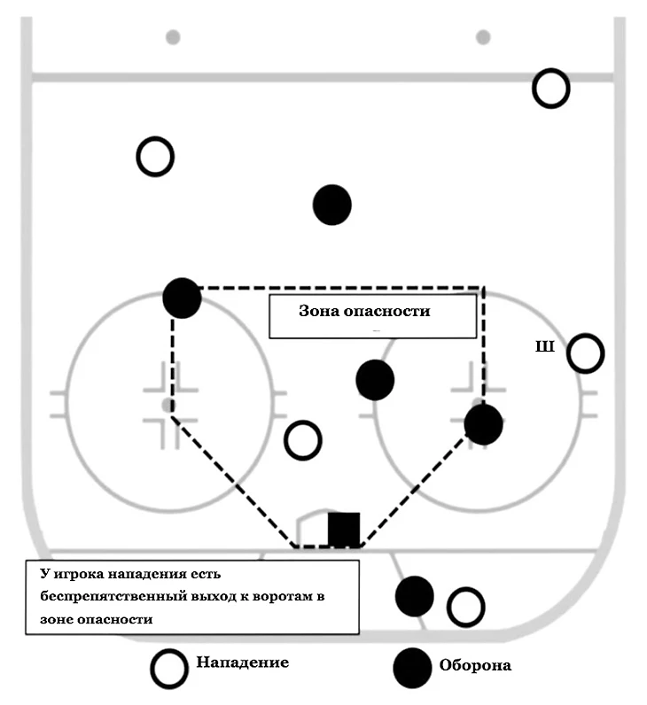 • и, наконец, этот игрок в зоне опасности должен иметь беспрепятственный выход на ворота. Под этим мы понимаем, что если игрок получает шайбу и готов нанести бросок, никто из защитников не сможет его заблокировать.