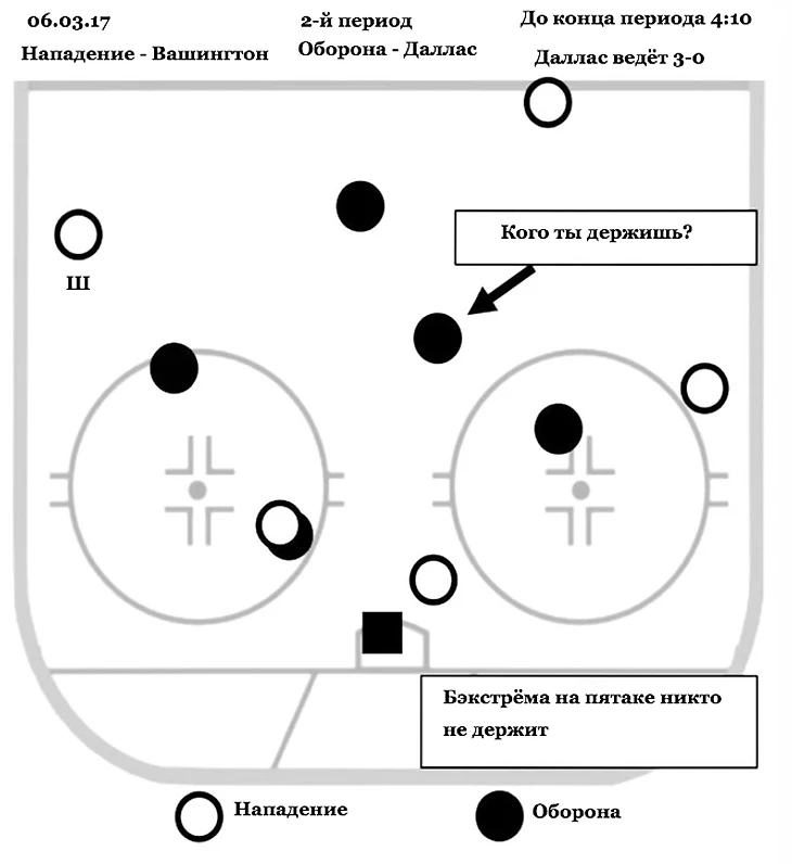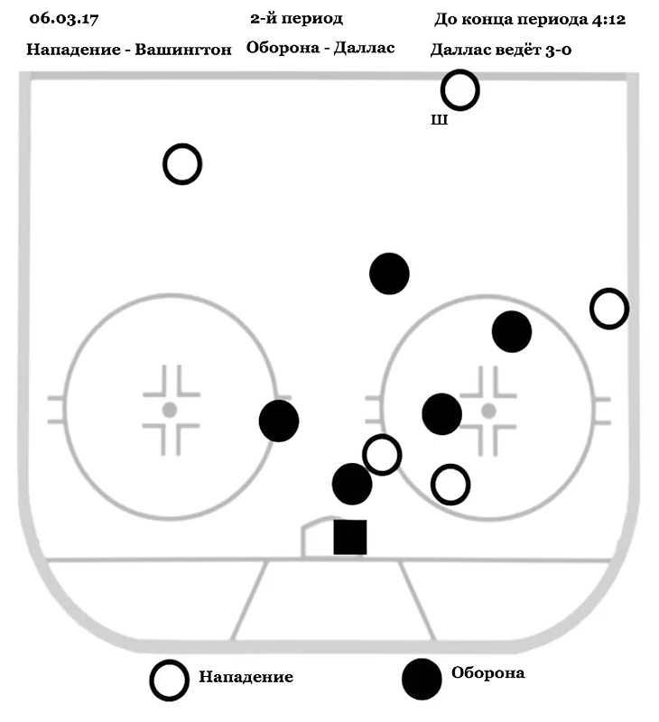 Следующий пример мы взяли из матча между «Вашингтоном» и «Далласом» 6 марта. После вбрасывания в зоне «Далласа» шайбой на синей линии завладевают «Кэпиталс».