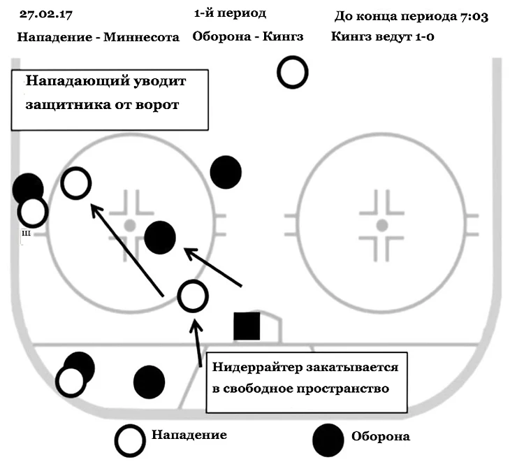 Один защитник «Лос-Анджелеса» находится в правильной позиции перед воротами и закрывает своего игрока, но как только его партнер вступает в борьбу за шайбу у борта, на нем остаются два нападающих. Игрок, включившийся в борьбу за шайбу у борта, оставил неприкрытым форварда «Миннесоты» Нино Нидеррайтера, который находится за воротами. В этом эпизоде важно следить именно за ним.