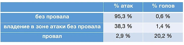 Нижеприведенная таблица отображает данные по провалам в обороне. В колонке «% атак» отображен процент всех ситуаций владения при равных составах соответствующей категории. В «% голов» отображен процент атак соответствующей категории, которые завершаются взятием ворот. В таблице не учтены контратаки, которые составляют 1,8% всех атак в равных составах.