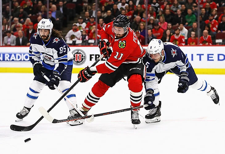 В первом периоде при разности в один гол игроки «Виннипега» владеют шайбой в зоне атаки. Защита «Монреаля» расположилась достаточно хорошо. На данный момент ни у кого из соперников нет беспрепятственного выхода на ворота, но обратите внимание на игрока в зоне опасности. Это Матье Перро.