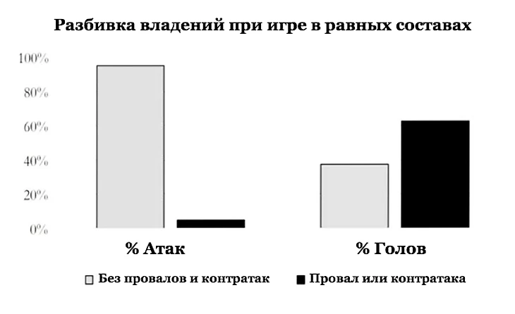 Провалы и контратаки составляют малую долю от общего числа ситуаций владения в матче. Более того, контратак и провалов нет в 95,3% всех ситуаций владения при игре в равных составах. Провалы и контратаки приходятся лишь на 4,7% всех ситуаций владения при игре в равных составах, но на них приходятся 62,6% заброшенных шайб при игре «пять на пять». Еще раз – 62,6% всех заброшенных шайб при игре в равных составах приходятся на 4,7% ситуаций владения, в которых допускаются позиционные ошибки в обороне.
