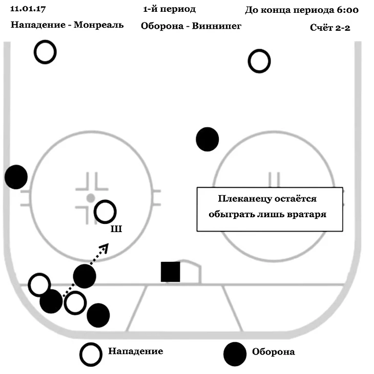 Какой альтернативный вариант здесь может быть? Допустим, дополнительный игрок «Виннипега» не отправляется в борьбу у борта и шайбой завладевают монреальцы. У них неудобная позиция. Несмотря на владение шайбой, они застряли в углу, а в непосредственной близости находятся два игрока «Джетс». Более того, два нападающих «Монреаля» стоят вплотную друг к другу, что уменьшает количество вариантов для передачи. Поскольку дополнительный игрок «Виннипега» не отправился в борьбу у борта, все монреальцы, которым можно было бы сделать передачу, разобраны. Любая попытка перевести шайбу обратно в центр зоны, скорее всего, потерпит неудачу и может привести к контратаке «Виннипега».