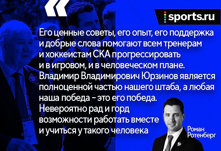 Владимир Юрзинов – выдающийся тренер и имеет огромный опыт. Неудивительно, что именно он консультант тренерского штаба СКА, а также советник Романа Ротенберга. Легенда советского хоккея помогает нынешнему тренеру, делится полезным опытом – что постоянно подчеркивается в личном телеграм-канале Ротенберга.