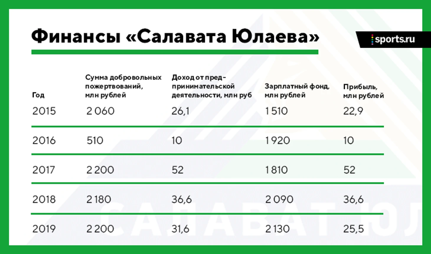 В 2016 году сумма добровольных пожертвований (деньги от фонда) составила чуть больше 500 млн рублей, но по данным «Росстата» в том же году на продаже работ, продукции, товаров и услуг «Салават Юлаев» заработал больше 2 млрд рублей. При этом доход от предпринимательской деятельности – всего 10 миллионов. Скорее всего, 2 млрд рублей – тоже деньги от «Башнефти», которые представили в виде доходов от рекламы (мы подробно разбирали эти случаи на примере отчетности клубов за 2019 год).